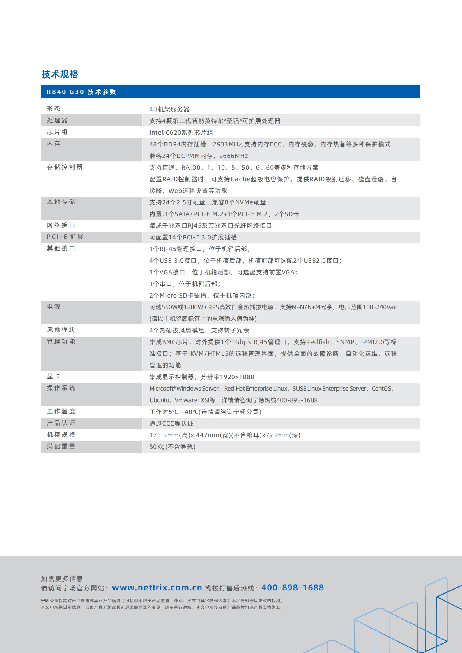 宁畅 R840 G30 机架式服务器 4U机架服务器 支持4颗第二代智能英特尔®至强®可扩展处理器 Intel C620系列芯片组 48个DDR4内存插槽,2933MHz,支持内存ECC、内存镜像、内存热备等多种保护模式 兼容24个DCPMM内存,2666MHz